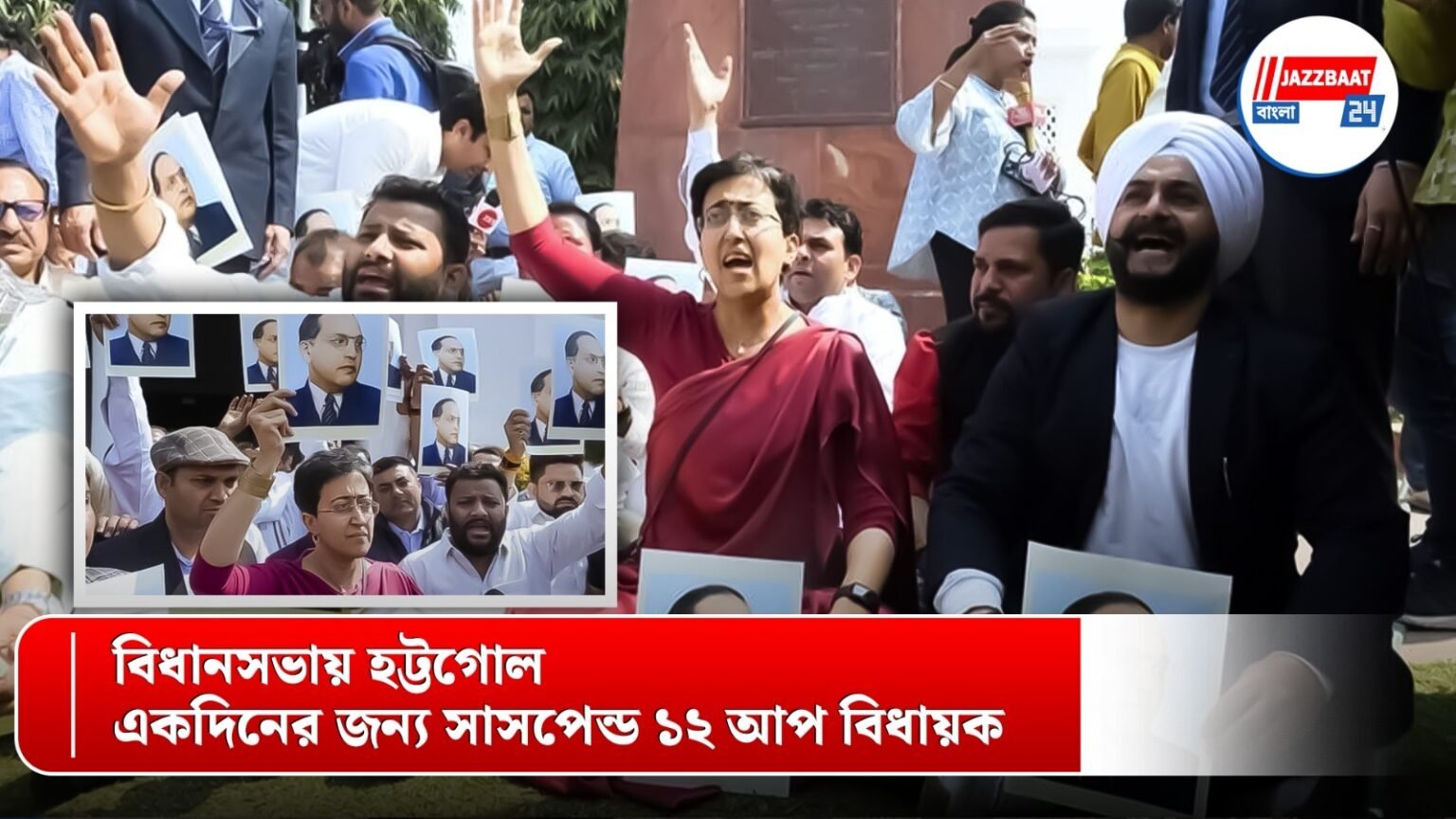 অধিবেশনে বিশৃঙ্খলা সৃষ্টির অভিযোগে অবশেষে ১২ জন আপ বিধায়ককে এক দিনের জন্য সাসপেন্ড করা হয়। কিন্তু বিধানসভা থেকে বেরিয়েও তারা থামেনি। বাইরে এসে বাবাসাহেবের ছবি হাতে নিয়ে বিজেপির বিরুদ্ধে বিক্ষোভ দেখাতে থাকে তারা। অতিশি সরাসরি মোদীকে নিশানা করে বলেন, “মোদী কি বাবাসাহেব অম্বেডকরের থেকেও বড়?”