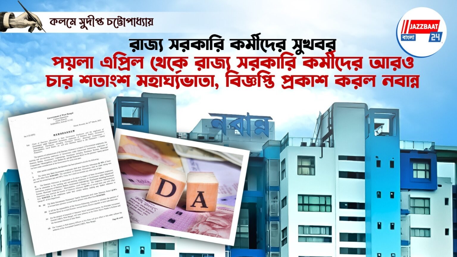 বাজেট অধিবেশনে রাজ্য সরকারি কর্মচারীদের আরও চার শতাংশ মহার্ঘ্যভাতা দেওয়ার কথা ঘোষণা করেছিল রাজ্য সরকার। এবার সেই ঘোষণা মোতাবেক সরকার বিজ্ঞপ্তি জারি করল নবান্ন। রাজ্য অর্থ দপ্তরের প্রধান সচিব প্রভাত কুমার মিশ্রের জারি করা এই সরকারি বিজ্ঞপ্তিতে জানানো হয়েছে আগামী পয়লা এপ্রিল থেকে অতিরিক্ত চার শতাংশ মহার্ঘ্যভাতা রাজ্য সরকারি কর্মচারীদের মূল বেতনের সঙ্গে যুক্ত হবে। সদ্যসমাপ্ত রাজ্য বিধানসভার বাজেট অধিবেশনে আগামী অর্থবর্ষের জন্য ৪ শতাংশ মহার্ঘ ভাতার প্রস্তাব দেওয়া হয়েছিল। এর আগে ১৪ শতাংশ ভাতা যুক্ত হয়েছে। সেই কারণে আগামী পয়লা এপ্রিল থেকে ১৮% হারে মহার্ঘ্যভাতা রাজ্য সরকারি কর্মচারীদের জন্য প্রযোজ্য হবে। রাজ্য জানানো হয়েছে মূল সরকারি কর্মচারীরা ছাড়াও এই নতুন চার শতাংশ মহার্ঘ্যভাতার সঙ্গে যুক্ত হবেন রাজ্যের সরকার পোষিত সমস্ত প্রতিষ্ঠানের কর্মী, পুরসভা, পুরনিগম ও পঞ্চায়েত কর্মীরাও। পেনশনভোগী অবসরপ্রাপ্ত সরকারি কর্মী এবং পারিবারিক পেনশনভোগীরাও এই মহার্ঘ্যভাতার আওতায় আসবেন বলে জানিয়েছে রাজ্য অর্থ দপ্তর।