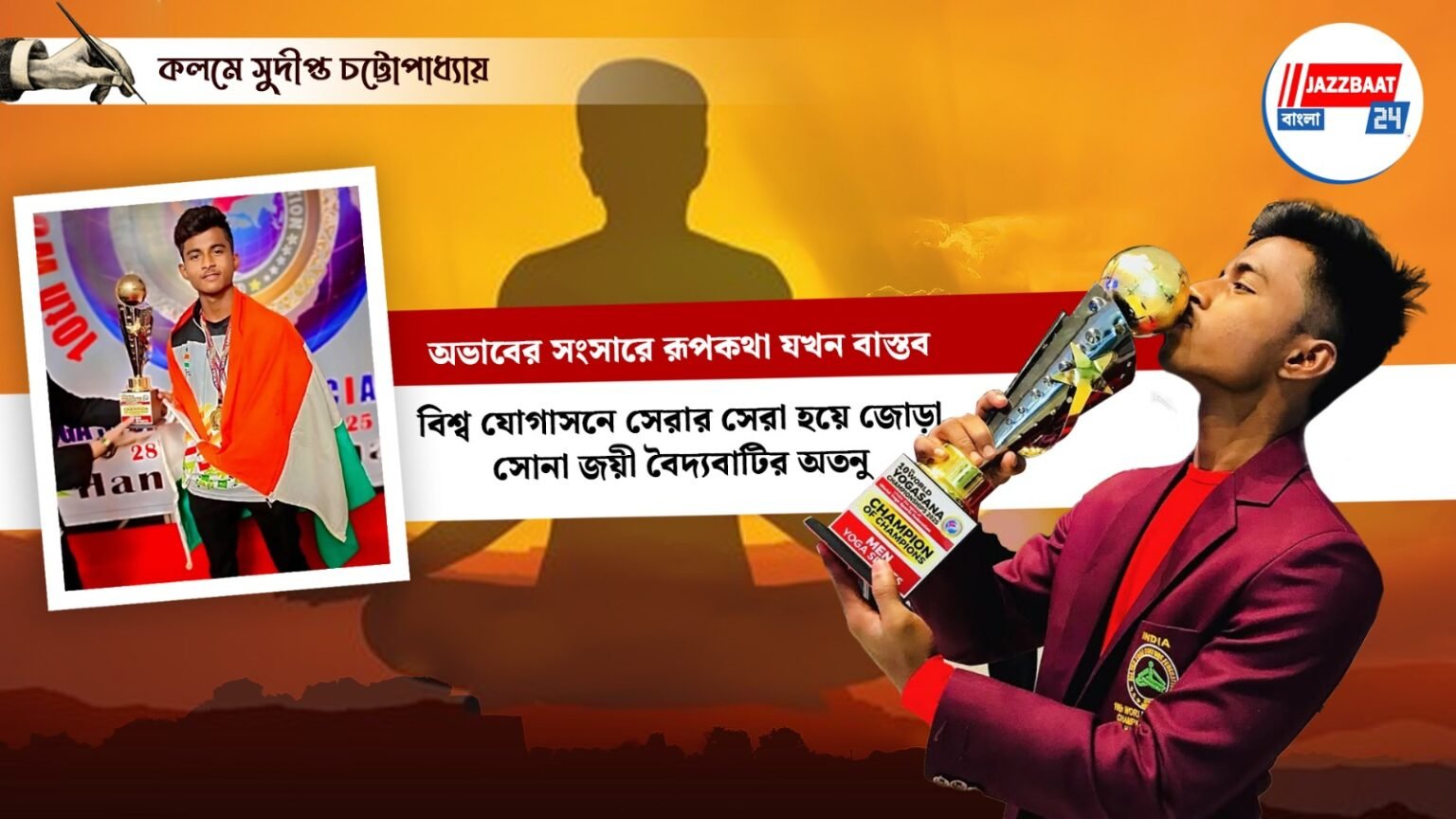 নিষ্ঠা,অধ্যবসায় এবং স্বপ্ন পূরণের জেদ যদি থাকে তাহলে অসাধ্য সাধন করা যায়। যে অভাবী সংসারে নুন আনতে পান্তা ফুরোয় অবস্থা সেই সংসারের মধ্যমণি এখন জোড়া সোনার পদক। শুনতে কিছুটা রূপকথা মনে হলেও এই রূপকথাকে বাস্তবের মাটিতে নামিয়ে এনেছে হুগলির বৈদ্যবাটির অতনু হালদার। যে হালদার পরিবারে যোগাসন করাটাও ছিল বিলাসিতা নিম্নবিত্ত প্রান্তিক পরিবারের অতনু ভিয়েতনামে অনুষ্ঠিত বিশ্ব যোগাসন চ্যাম্পিয়নশিপ ২০২৫-এ বালক বিভাগে সেরার সেরা শিরোপা অর্জন করেছে। জোড়া পদক নিয়ে মঙ্গলবার রাতেই বৈদ্যবাটি র ১৮ নম্বর ওয়ার্ডের দ্বারিক জঙ্গল রোডের ঘরে ফিরেছে সোনার ছেলে অতনু।