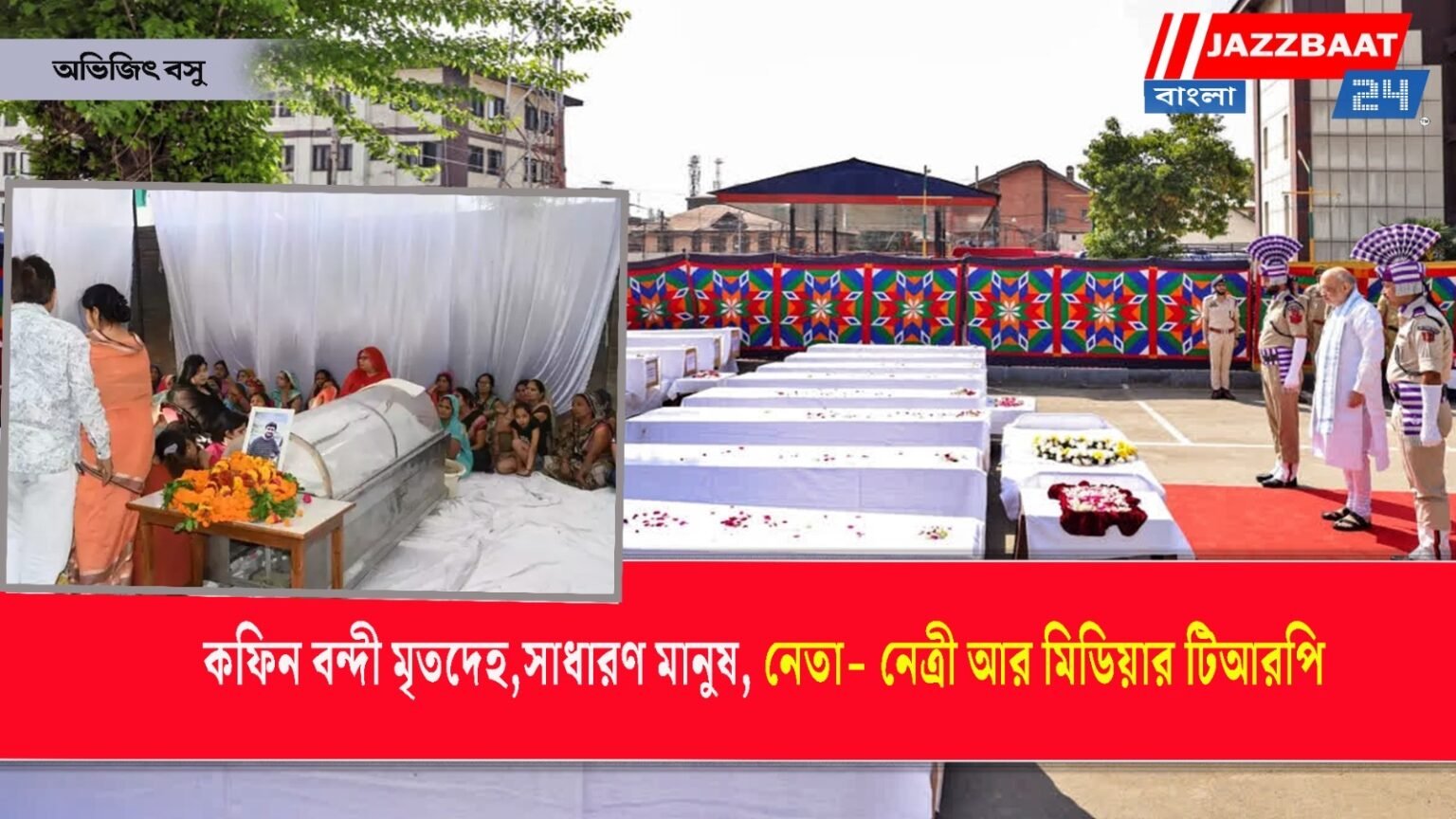 কফিন বন্দী মৃতদেহের সারি, ভীড় উপচে পড়া নেতা নেত্রীর ফোনালাপ, ফুলের মালায় আর গার্ড অব অনার দিয়ে ভালবাসার মানূষকে সম্মান জানিয়ে বিদায় দেওয়া, রাজনৈতিক দলের নেতাদের নেত্রীদের একে অপরকে ঠেলে এগিয়ে চলা সব কিছুর মাঝেই কেমন যেনো থমকে দাঁড়িয়ে পড়া। শোকের অভিঘাতে আহত হয়ে ফের বেঁচে থাকার চেষ্টা করা। যেখানে হিন্দু নেই, মুসলমান নেই, জাত নেই, ধর্ম নেই, রাজনীতি নেই, মৃতদেহকে নিয়ে টানাটানি নেই একে অপরকে দোষারোপ নেই। শুধু মাত্র একটি জীবন অন্য জীবনকে ছেড়ে চলে যাওয়া আছে। কান্না আছে, দুঃখ, কষ্ট যন্ত্রণা সহ্য করে বেঁচে থাকা আছে। যে বেঁচে থাকার স্বাদ বড়ো নোনতা। যে বেঁচে থাকার স্বাদ বড়ই আলুনি। ভিড়ের মাঝে সংগোপনে বেঁচে থাকার চেষ্টা করা।