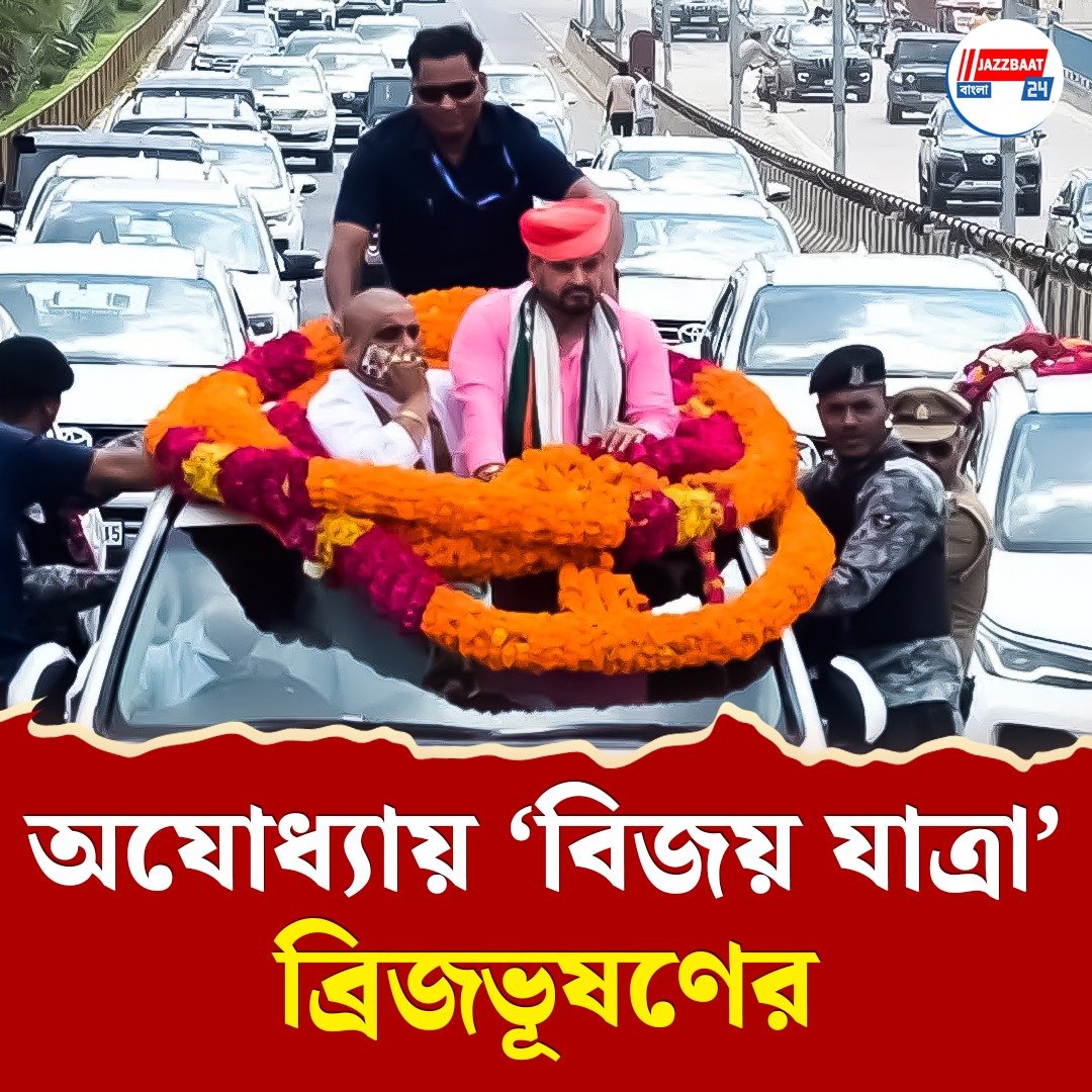 মহার্ষি বাল্মীকি ইন্টারন্যাশনাল এয়ারপোর্টে ব্রিজভূষণের বিমান অবতরণের সঙ্গে সঙ্গে বাদ্যযন্ত্র, ফুলবৃষ্টি আর শঙ্খধ্বনিতে তাঁকে রাজকীয়ভাবে স্বাগত জানানো হয়। এখান থেকেই শুরু হয়েছিল সেই বহু প্রতীক্ষিত ‘বিজয় যাত্রা’। প্রায় ৬০-টিরও বেশি গাড়ি নিয়ে বিশাল কনভয় অযোধ্যার রাজপথে নেমে। তাতে অংশ নিলেন হাজারেরও বেশি সমর্থক। লাল-হলুদ পতাকা হাতে ‘ব্রিজভূষণ জিন্দাবাদ’ এবং ‘সত্যের জয় হয়েছে’ স্লোগানে মুখর অযোধ্যা।
