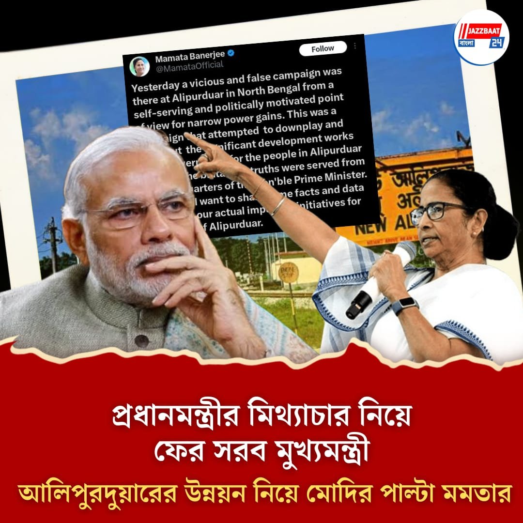 মুখ্যমন্ত্রী তার এক্স হ্যান্ডলের মাধ্যমে জানিয়েছেন, আলিপুরদুয়ারে দুটি শিল্প তালুক তৈরি করা হয়েছে এবং ১৪ হাজার এর বেশি এমএসসি ইউনিট হয়েছে। পর্যটকদের সুবিধার জন্য হোমস্টে তৈরি করার ব্যাপারে উৎসাহ দিয়েছে রাজ্য সরকার। যাতে স্থানীয় মানুষের কাজ হয়। সেখানে রেজিস্টার্ড হোম স্টে-র সংখ্যা ৭৪। বাংলার বাড়ি প্রকল্পের অধীনে ৪৫৫১১ টি পরিবারের বাড়ি তৈরি করার জন্য ৫৪৬.১৩ কোটি টাকা বরাদ্দ করা হয়েছে রাজ্য সরকারের পক্ষ থেকে। পাশাপাশি ৪,২৬৬ কিলোমিটার রাস্তা তৈরি করা হয়েছে পথশ্রী প্রকল্পের মাধ্যমে। ৪৫টি নতুন ব্রিজ তৈরি করা হয়েছে। মুখ্যমন্ত্রী জানিয়েছেন, রাজবংশী ও কামতাপুরীকে সরকারি ভাষার মর্যাদা দেওয়া হয়েছে। এছাড়া ২০০ টি রাজবংশী স্কুলকে সরকারি অনুমোদনের আওতায় আনা হয়েছে। মুখ্যমন্ত্রী জানিয়েছেন, প্রধানমন্ত্রী নরেন্দ্র মোদি যেভাবে রাজনৈতিক প্ররোচনামূলক বক্তব্য পেশ করেছেন তা মোটেই সুখকর নয়। উল্লেখযোগ্য, গতকালই মমতা বন্দ্যোপাধ্যায়ের নবান্ন থেকে প্রধানমন্ত্রী নরেন্দ্র মোদিকে তীব্র আক্রমণ করে জানিয়েছিলেন নরেন্দ্র মোদি “মিথ্যাচারী ব্যবসাদার”। শুক্রবার নিজের এক্স হ্যান্ডলে সেই দাবির স্বপক্ষে আলিপুরদুয়ার নিয়ে মোদির ভাষণের মিথ্যা তথ্যের পাল্টা সত্যাসত্য প্রকাশ করলেন মুখ্যমন্ত্রী মমতা বন্দ্যোপাধ্যায়।