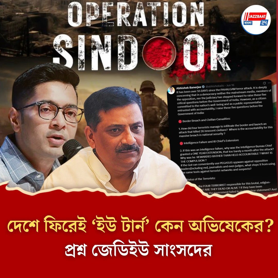 ‘অপারেশন সিঁদুর’ নিয়ে বিদেশের মাটিতে মোদী সরকারের প্রশংসা করেছিলেন তৃণমূলের সর্বভারতীয় সাধারণ সম্পাদক অভিষেক বন্দ্যোপাধ্যায়। দেশে ফিরেই ‘ইউ টার্ন’! পাঁচ প্রশ্নে বিদ্ধ করেছেন মোদী সরকারকে। আর এতেই অবাক জেডিইউ সাংসদ সঞ্জয় ঝা। তাঁর কথায়, “তিনি (পড়ুন- অভিষেক বন্দ্যোপাধ্যায়) যে পাঁচ জায়গায় গিয়েছিলেন, সেখানে ‘অপারেশন সিঁদুরে’র সাফল্যের কথাই তো তুলে ধরেছেন। সরকারের প্রশংসাও করেছেন। তাহলে দেশে ফিরেই হঠাৎ এমন মন্তব্য কেন?”