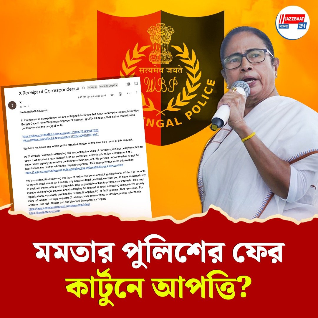 MANJULtoons একজন এডিটোরিয়াল কার্টুনিস্ট। একাধিক সংবাদমাধ্যমের জন্য কার্টুন এঁকে থাকেন। এমনই বছর ছয় আগে এক সংবাদপত্রের জন্য আঁকা ছবিতে আপত্তি পুলিশের। MANJUL নামে ওই পেজে এক্সের পাঠানো ইমেলের কপি তুলে ধরা হয়েছে। যেখানে বলা হয়েছে, পশ্চিমবঙ্গ পুলিশের তরফে তাদের একটি বার্তা দেওয়া হয়েছে, যেখানে MANJULtoons-এর পোস্ট করা কনটেন্ট ভারতের আইনকে লঙ্ঘন করছে বলে দাবি করা হচ্ছে।