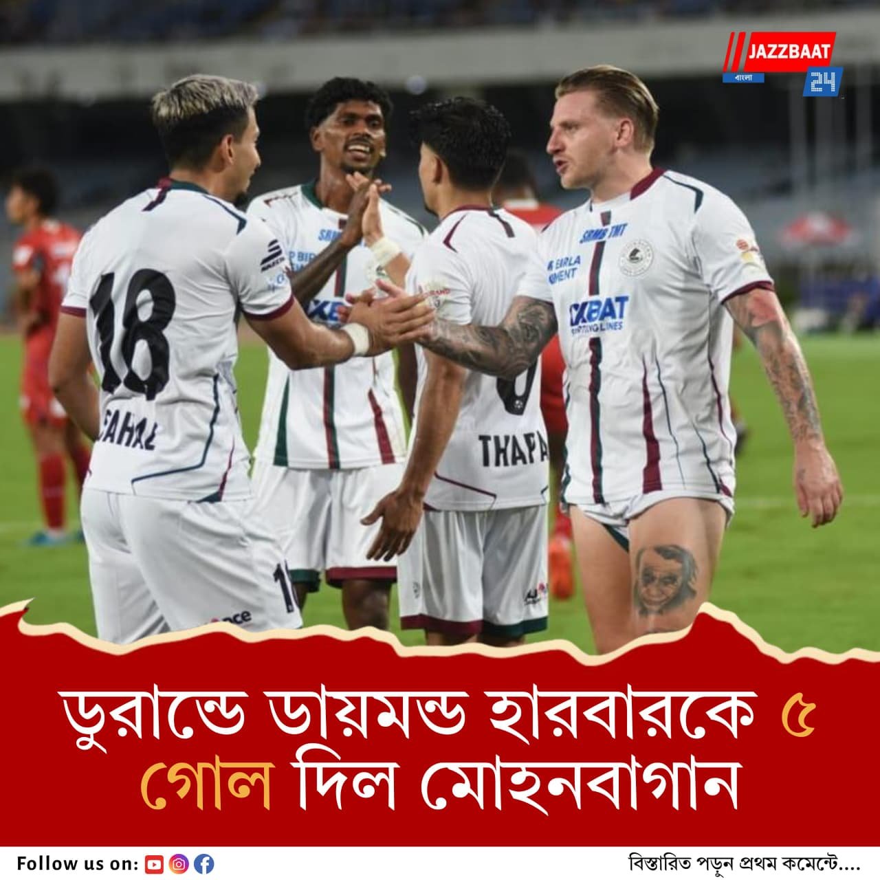 ডুরান্ড কাপ ফুটবলের নকআউট পর্বে উঠে গেল গতবারের রানার্স মোহনবাগান সুপার জায়েন্ট। গ্রুপ বি-র শেষ ম্যাচে ডায়মন্ড হারবার এফসিকে হারাল ৫-১ গোলের ব্যবধানে। গ্রুপ চ্যাম্পিয়ন টিমের গোলদাতারা হলেন অনিরুদ্ধ থাপা, জেমি ম্যাকলারেন, লিস্টন কোলাসো, সাহাল আব্দুল সামাদ ও জেসন কামিংস। অন্যদিকে ডায়মন্ড হারবারের ব্যবধান কমিয়েছেন লুকা মাজসেন। বিরতিতে মোহনবাগান ২-১ গোলে এগিয়েছিল।
