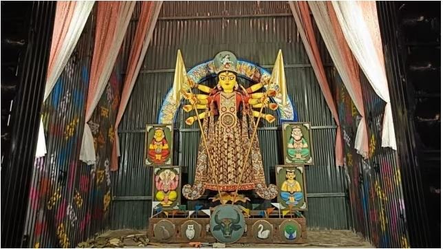 এই মণ্ডপে পুরোহিতের মন্ত্রোচারণ এবং ঢাকের বাদ্দি আশপাশের এলাকায় প্রতিধ্বনিত হয়। প্যান্ডেলের প্রাণবন্ত শৈল্পিকতা এবং আলোর রোশনাই ঝলমলিয়ে ওঠে। দর্শনার্থীরা এখানে এলেই দেখতে পান যে, নির্বাচনের আগে সমস্ত রাজনৈতিক দলের মতোই দেয়াল লিখনের মতো, এখানেও মণ্ডপ জুড়ে রয়েছে নানান চিত্রকর্ম।