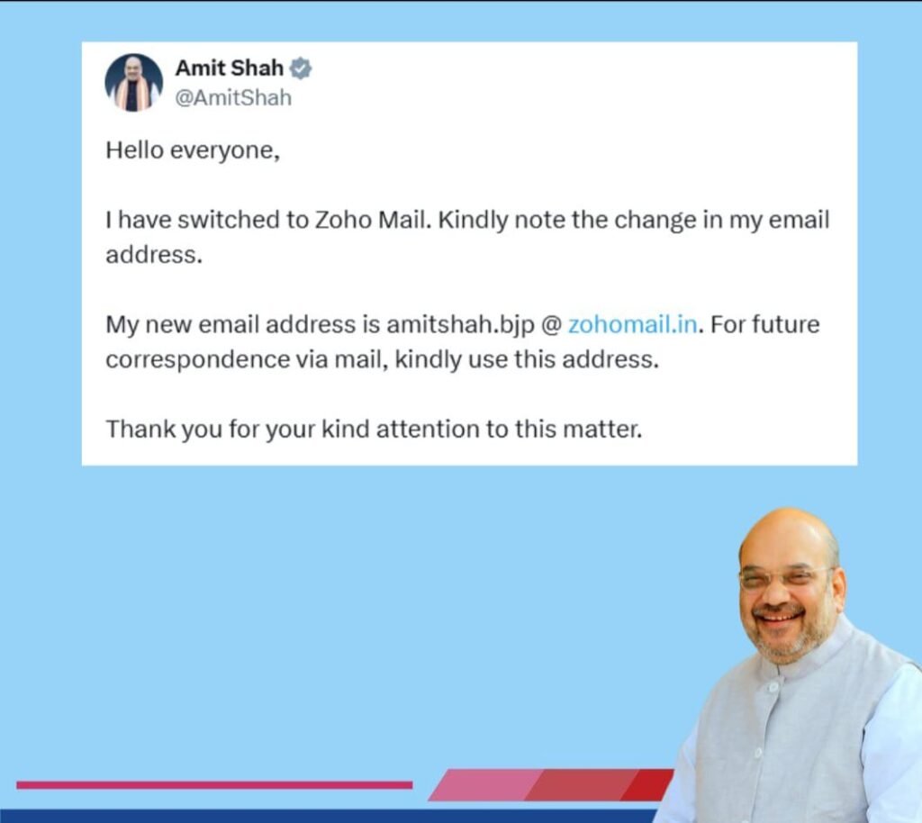অমিত শাহ তাঁর পোস্টে লিখেছেন, “সবাইকে শুভেচ্ছা, আমি এখন থেকে জোহো মেইল ব্যবহার করছি। অনুগ্রহ করে আমার ইমেইল ঠিকানার এই পরিবর্তনটি মনে রাখুন। আমার নতুন ইমেইল ঠিকানা হলো – amitshah.bjp@zohomail.in