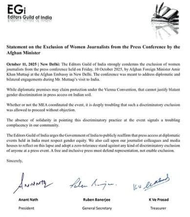 এডিটর্স গিল্ড অফ ইন্ডিয়া এবং ইন্ডিয়ান ওম্যান প্রেসক্লাব পৃথক বিবৃতি দিয়ে এই ঘটনাকে “লজ্জাজনক ও বৈষম্যমূলক” বলে অভিহিত করেছে। তারা বলেছে “ভারতের মতো গণতান্ত্রিক দেশে মহিলা সাংবাদিকদের বাদ দেওয়া সংবিধানের মৌলিক নীতির পরিপন্থী।”