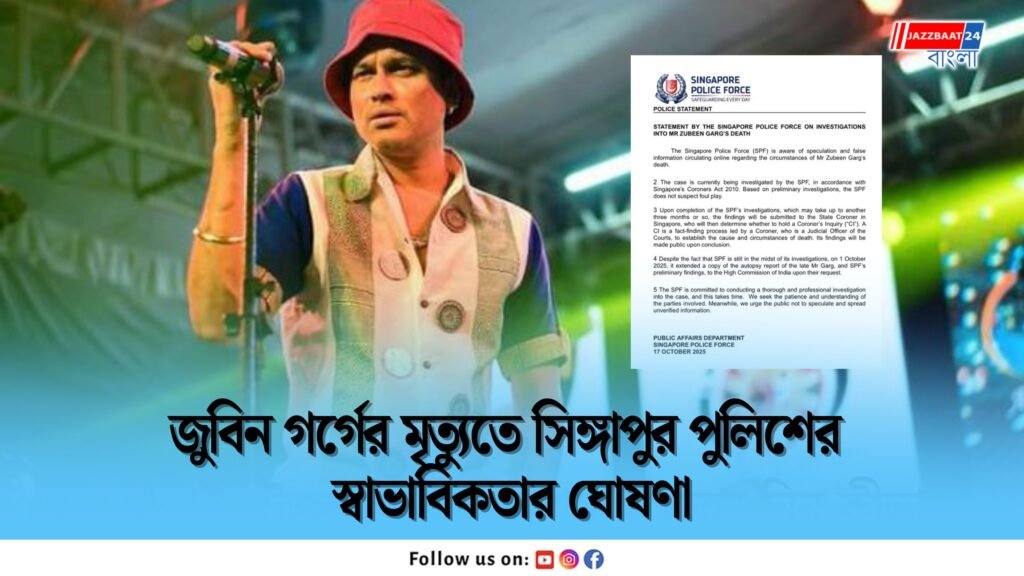 এই পরিস্থিতিতে সিঙ্গাপুর পুলিশ সম্প্রতি জুবিনের মৃত্যু নিয়ে আনুষ্ঠানিক বিবৃতি প্রকাশ করেছে। সেখানে বলা হয়েছে, জুবিনের মৃত্যুতে কোনও অস্বাভাবিকতা ধরা পড়েনি এবং কোনো ষড়যন্ত্রের তথ্যও পাওয়া যায়নি। পুলিশ আরও জানিয়েছে, এই বিষয়ে ভুয়ো খবর ছড়ানো থেকে বিরত থাকতে হবে। যদিও তদন্ত শেষ হয়নি, আগামী তিন মাস পর্যন্ত তদন্ত চলবে এবং অসম সরকারের সঙ্গে সমন্বয় করে আরও রিপোর্ট পেশ করা হবে।