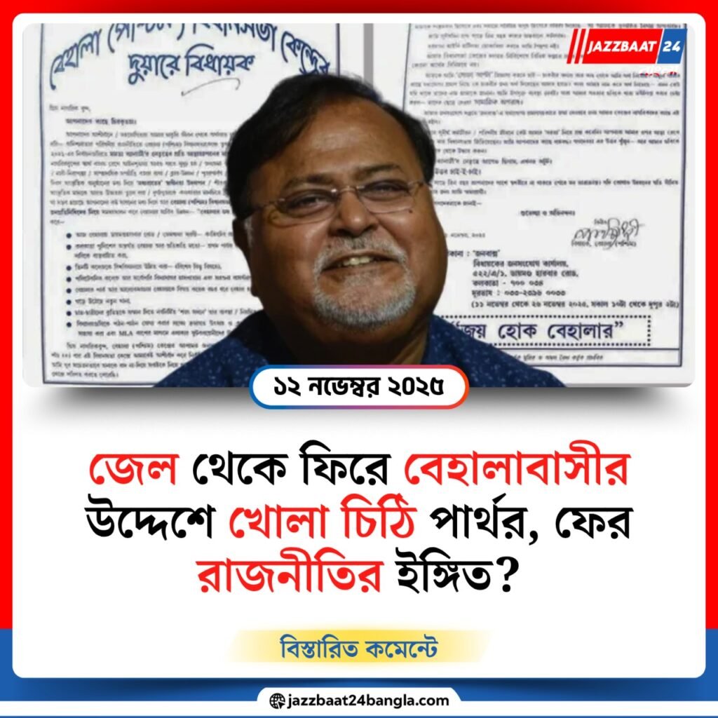 তিন বছর তিন মাস উনিশ দিনের দীর্ঘ কারাবাসের পর মুক্তি পেয়েছেন রাজ্যের প্রাক্তন শিক্ষামন্ত্রী ও বেহালা পশ্চিমের বিধায়ক পার্থ চট্টোপাধ্যায়। মঙ্গলবার বাড়ি ফেরার পর দিনই তিনি নিজের এলাকার মানুষের উদ্দেশে এক খোলা চিঠি লেখেন, যা এখন রাজনৈতিক মহলে নতুন জল্পনার সৃষ্টি করেছে।