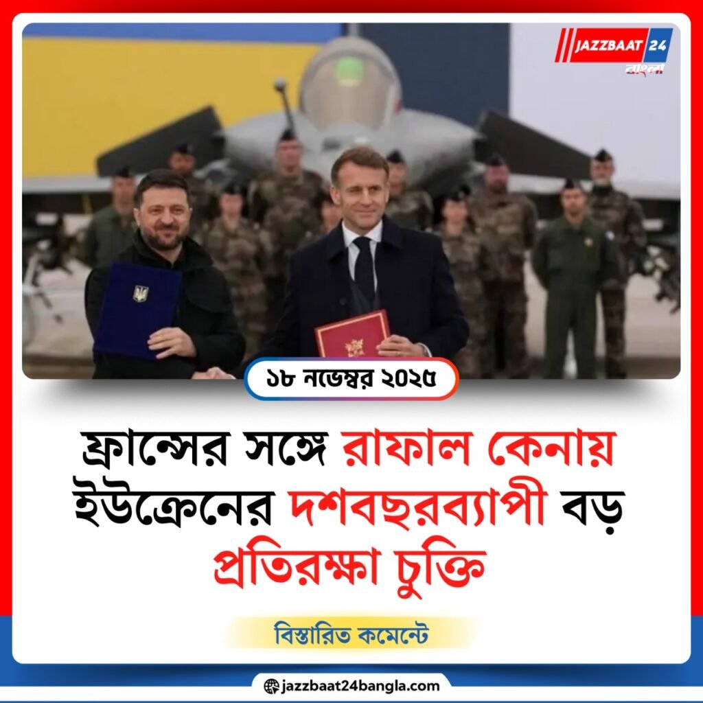 ইউক্রেন আগামী দশ বছরে ফ্রান্স থেকে সর্বোচ্চ একশ রাফাল যুদ্ধবিমান, আধুনিক ড্রোন, আকাশ প্রতিরক্ষা ব্যবস্থা ও গুরুত্বপূর্ণ সামরিক প্রযুক্তি সংগ্রহের প্রাথমিক চুক্তি সই করেছে। প্যারিসে দুই দেশের প্রেসিডেন্টের বৈঠকে এই চুক্তি ইউক্রেনের দীর্ঘমেয়াদি নিরাপত্তা কৌশলে সবচেয়ে বড় পদক্ষেপ হিসেবে দেখা হচ্ছে।