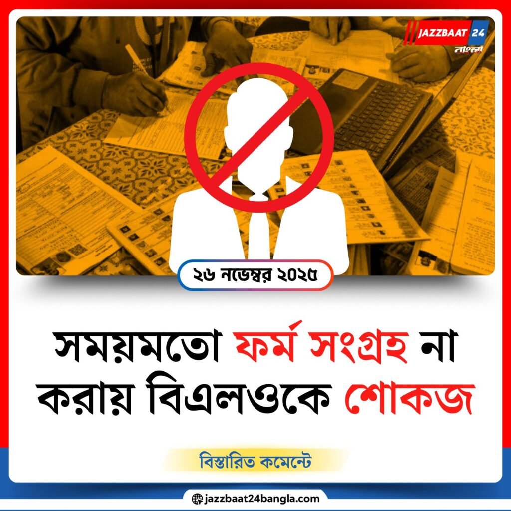 দক্ষিণ চব্বিশ পরগনার মহেশতলা পুরসভার ১৬ নম্বর ওয়ার্ডের ১৭ নম্বর বুথে নির্ধারিত সময়সূচির মধ্যে ফরম সংগ্রহ ও ডিজিটাইজেশন সম্পূর্ণ না করায় এক বিএলওকে শোকজ করেছে নির্বাচন কমিশন। ফরম বিতরণ ও সংগ্রহের গুরুত্বপূর্ণ দায়িত্বে থাকা ফরিদা খাতুন মোট ৮১২টি ফরম বিলি করলেও প্রায় ৪৫০টি ফরম সংগ্রহের পর আর কাজে যোগ দেননি বলে অভিযোগ ওঠে। গুরুত্বপূর্ণ এই কাজ অসম্পূর্ণ থাকায় কমিশন তাঁর কাছ থেকে ব্যাখ্যা চেয়েছে।