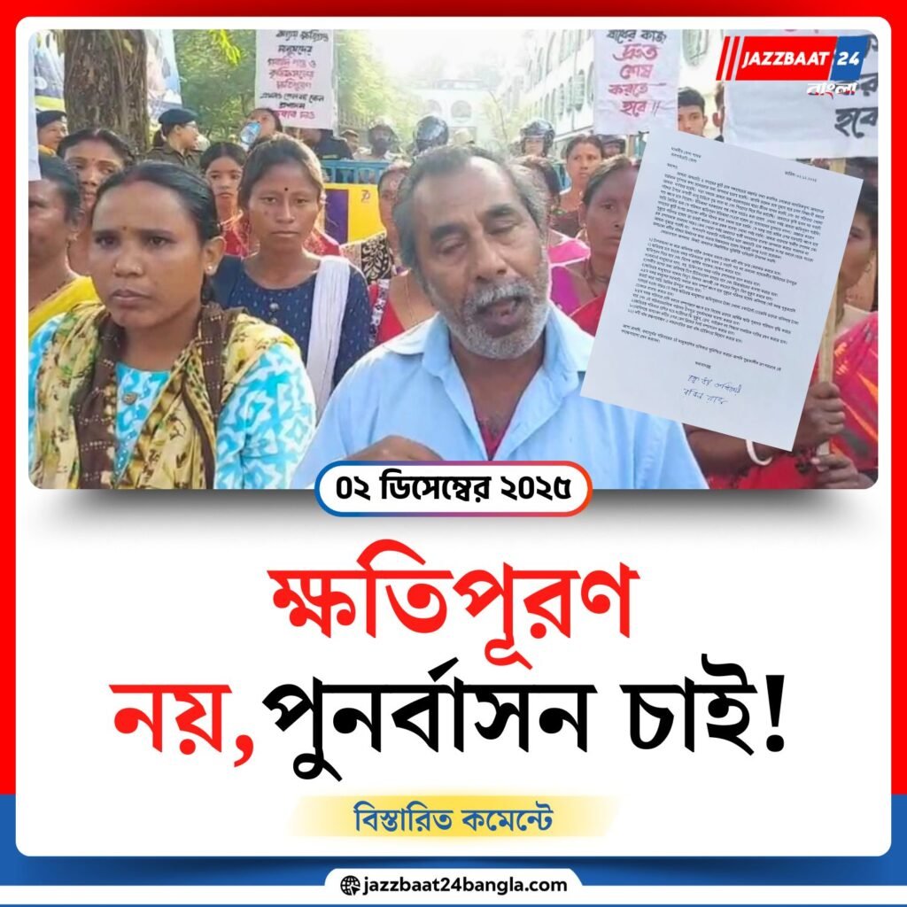 ক্ষতিপূরণ নয়, স্থায়ী পুনর্বাসনের দাবিতে উত্তাল হয়ে উঠল জলপাইগুড়ি জেলাশাসকের দফতর চত্বর। উত্তরবঙ্গের ভয়াবহ বন্যায় ক্ষতিগ্রস্ত দুই ব্লক ধুপগুড়ি ও ময়নাগুড়ির একাধিক গ্রামের বাসিন্দারা সোমবার সকালে মিছিল করে হাজির হন জেলা প্রশাসনের দরজায়। গধেয়ারকুঠি, আমবাড়ি সহ বিভিন্ন গ্রামের প্রায় শতাধিক মানুষ দাবি তুলেছেন দ্রুত পুনর্বাসনের পাশাপাশি এলাকার বাঁধ নির্মাণের। ফলে প্রশাসনিক ভবনের সামনে তৈরি হয় উত্তেজনা, যাতে নিয়ন্ত্রণ রাখতে মোতায়েন ছিল কোতোয়ালি থানার বিশাল পুলিশ বাহিনী।