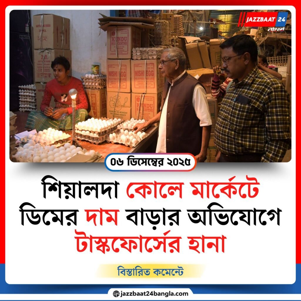 হঠাৎ বেড়ে যাওয়া ডিমের দামের জেরে নড়েচড়ে বসল প্রশাসন। শনিবার দুপুরে শিয়ালদার কোলে মার্কেটে হানা দেয় কলকাতা পুলিশের বিশেষ টাস্কফোর্স ও এনফোর্সমেন্ট শাখার যৌথ দল। বাজারজুড়ে গত এক সপ্তাহে ডিমের খুচরো দাম লাফিয়ে বাড়ায় ক্রেতাদের মধ্যে ক্ষোভ বাড়ছিল। অভিযোগ ছিল, কয়েকজন পাইকারি বিক্রেতা কৃত্রিম সংকট তৈরি করে দাম বাড়িয়ে দিচ্ছেন। সেই অভিযোগ খতিয়ে দেখতেই অভিযান।