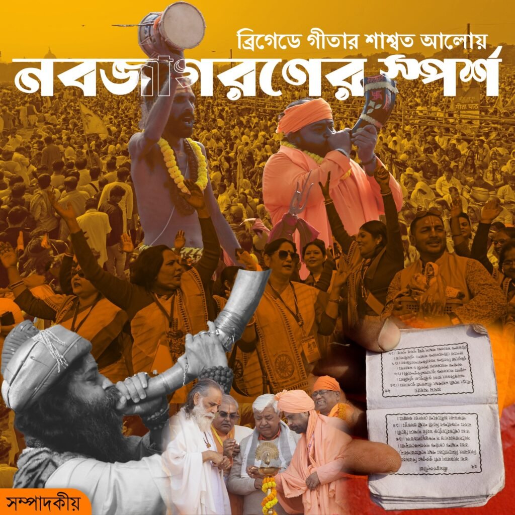 ব্রিগেডের মাঠে আজ যেন পুরনো দিনের পবিত্র মন্ডপ ফিরে এল, যেখানে গীতার বাণী শুনে মানুষ নতুন শক্তি পেত। বোতলবন্দি জীবনের ভেতর যে সৌম্যতা, ধৈর্য আর গভীর চিন্তার অভাব দিন দিন প্রকট হচ্ছে, গীতা তার প্রতিষেধক। গীতা শেখায় বাহ্যিক ঝড় থামানো আমাদের কাজ নয়, কিন্তু অন্তরের ঝড় থামানোই প্রকৃত সাধনা। এই পাঠ যেন সেই কথাটাই আবার মনে করিয়ে দিল।