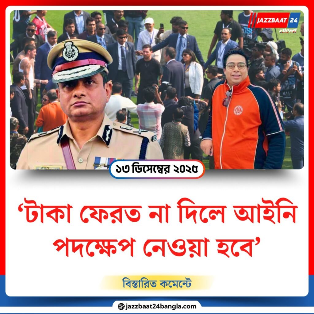 কলকাতায় লিওনেল মেসির GOAT Tour ঘিরে চরম বিশৃঙ্খলার পর এবার কড়া অবস্থান নিল রাজ্য প্রশাসন। যুবভারতী ক্রীড়াঙ্গনে আয়োজিত অনুষ্ঠানে হাজার হাজার দর্শক টিকিট কেটেও মেসিকে দেখতে না পেয়ে ক্ষোভে ফেটে পড়েন। পরিস্থিতি সামাল দিতে নামতে হয় পুলিশকে। এই ঘটনার পর দর্শকদের টাকা ফেরত না দিলে আইনি ব্যবস্থা নেওয়া হবে বলে সাফ জানিয়ে দিলেন রাজ্যের ডিজি রাজীব কুমার।