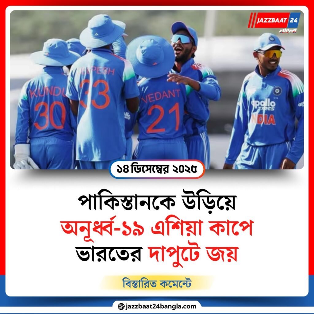 অনূর্ধ্ব-১৯ এশিয়া কাপ ২০২৫-এ নিজেদের দুর্দান্ত ফর্ম বজায় রাখল ভারতীয় দল। রবিবার দুবাইয়ের আইসিসি অ্যাকাডেমি গ্রাউন্ডে গ্রুপ পর্বের দ্বিতীয় ম্যাচে চিরপ্রতিদ্বন্দ্বী পাকিস্তানকে ৯০ রানে হারিয়ে টুর্নামেন্টে দ্বিতীয় জয় তুলে নিল ভারত। এই জয়ের ফলে দুই ম্যাচে চার পয়েন্ট নিয়ে গ্রুপ এ-র শীর্ষে উঠে এল যুবা ভারত।