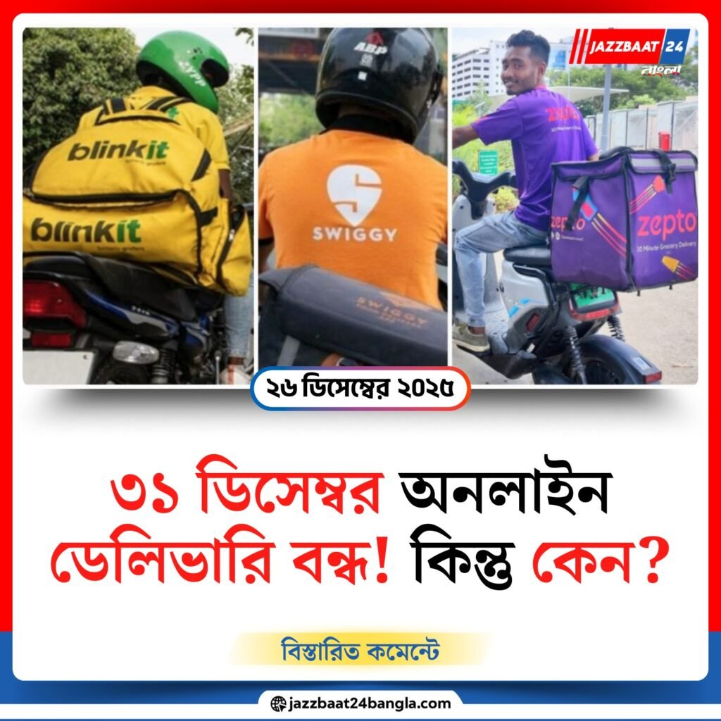 বছরের শেষ দিনে উৎসবের আনন্দে বড় ধাক্কা খেতে পারেন গ্রাহকরা। সুইগি, জোমাটো, ব্লিঙ্কিট, জেপ্টো, অ্যামাজন, ফ্লিপকার্ট-সহ বিভিন্ন অনলাইন ডেলিভারি ও ই-কমার্স সংস্থার গিগ ওয়ার্কাররা ৩১ ডিসেম্বর দেশজুড়ে কর্মবিরতির ডাক দিয়েছেন। এর ফলে ওই দিন অনলাইন খাবার বা ইনস্ট্যান্ট ডেলিভারি পরিষেবা কার্যত বন্ধ থাকার সম্ভাবনা তৈরি হয়েছে।