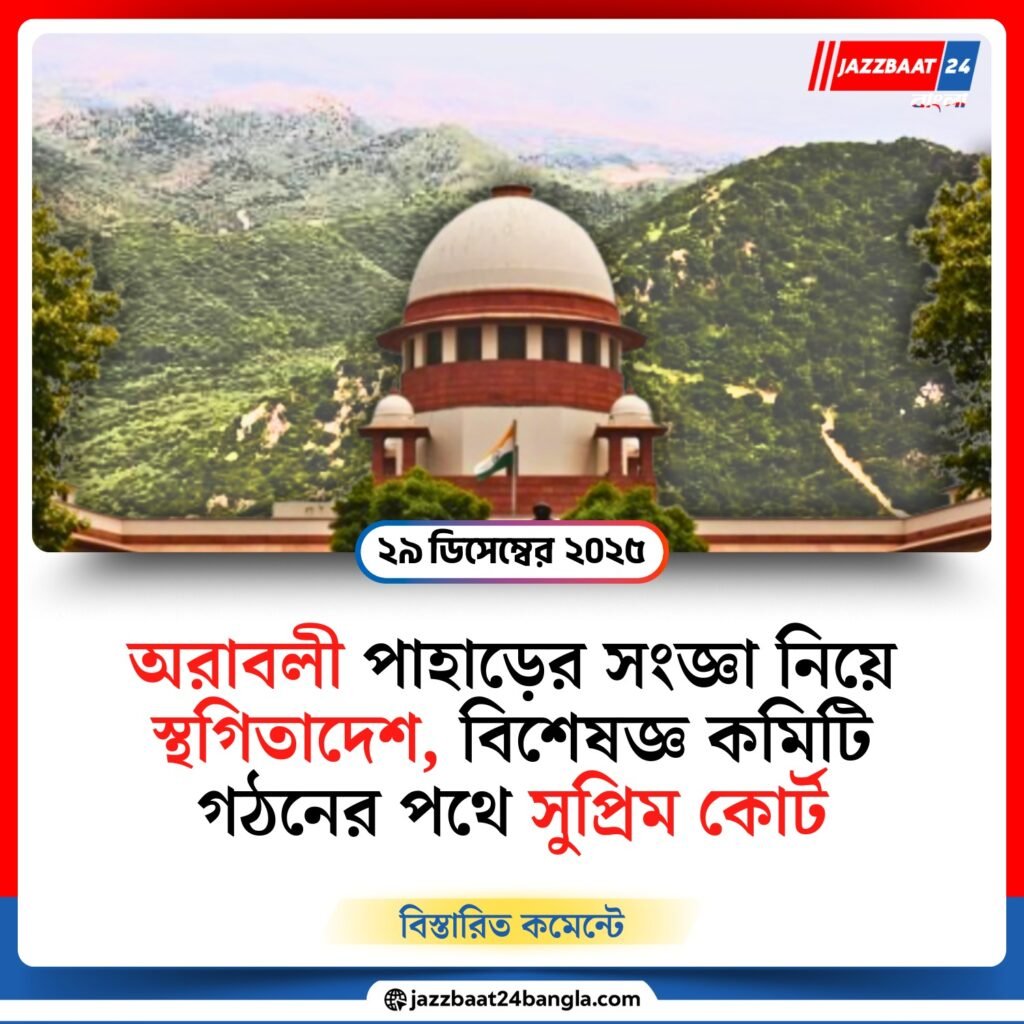 অরাবলী পাহাড়ের ‘সংজ্ঞা’ নির্ধারণ সংক্রান্ত বিতর্কে আপাতত ব্রেক টানল সুপ্রিম কোর্ট। সোমবার শীর্ষ আদালত জানিয়ে দিল, গত ২০ নভেম্বর দেওয়া এই সংক্রান্ত আগের নির্দেশ আপাতত কার্যকর করা যাবে না। বিষয়টি আরও স্পষ্ট ব্যাখ্যার প্রয়োজন রয়েছে বলে মনে করছে আদালত। পাশাপাশি, অরাবলী পাহাড়ের সংজ্ঞা নির্ধারণের ফলে পরিবেশের উপর কী প্রভাব পড়তে পারে, তা খতিয়ে দেখার জন্য একটি বিশেষজ্ঞ কমিটি গঠনের প্রস্তাবও দিয়েছে সুপ্রিম কোর্ট।