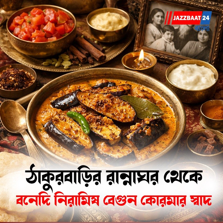 বাঙালির হেঁশেলে বৃহস্পতিবার মানেই শুদ্ধতা আর নিরামিষের এক স্নিগ্ধ আয়োজন। আর নিরামিষ রান্নাকে যদি শিল্পের পর্যায়ে নিয়ে যাওয়ার কৃতিত্ব কাউকে দিতে হয়, তবে তা নিঃসন্দেহে জোড়াসাঁকোর ঠাকুরবাড়ি। জোড়াসাঁকোর অন্দরমহলে রান্নাবান্না কেবল উদরপূর্তির মাধ্যম ছিল না, ছিল সৃজনশীলতার এক বিশাল চারণভূমি। মহর্ষি দেবেন্দ্রনাথ ঠাকুর থেকে শুরু করে রবীন্দ্রনাথ—বাড়ির প্রতিটি সদস্যের খাবারের রুচি ছিল অত্যন্ত মার্জিত এবং বৈচিত্র্যময়। ঠাকুরবাড়ির এই অসাধারণ সব রেসিপি এবং তাঁদের হেঁশেলের বিবর্তন সম্পর্কে আমরা জানতে পারি পূর্ণিমা ঠাকুরের কালজয়ী বই ‘ঠাকুরবাড়ির রান্না’ থেকে। পূর্ণিমা ঠাকুর ছিলেন গগনেন্দ্রনাথ ঠাকুরের নাতবউ। তিনি পরম মমতায় ঠাকুরবাড়ির অন্দরমহলের সেইসব হারিয়ে যাওয়া স্বাদকে সাধারণের নাগালে নিয়ে এসেছেন। আজ তেমনই এক রাজকীয় নিরামিষ পদ হলো ‘বেগুন কোরমা’। কোনো রকম পেঁয়াজ-রসুন ছাড়াই দই আর হিংয়ের জাদুকরী মিশেলে এই রান্নাটি নিরামিষ খাবারের সংজ্ঞাই বদলে দেয়।
