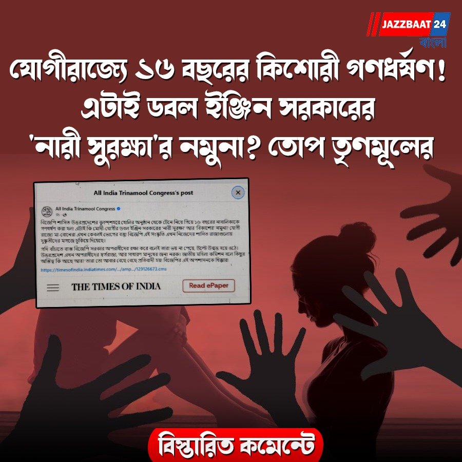 তৃণমূলের কংগ্রেস তাদের পোস্টে লিখেছে, “বিজেপি শাসিত উত্তরপ্রদেশের বুলন্দশহরে হোলির অনুষ্ঠান থেকে টেনে নিয়ে গিয়ে ১৬ বছরের নাবালিকাকে গণধর্ষণ করা হল! এটাই কি মোদী-যোগীর ডবল ইঞ্জিন সরকারের ‘নারী সুরক্ষা’ আর ‘বিকাশের’ নমুনা? যোগী রাজ্যে মা-বোনেরা এখন কেবলই ভোগের বস্তু! বিজেপি এই সংস্কৃতি এখন নিজেদের শাসিত রাজ্যগুলোয় দুষ্কৃতীদের মগজে ঢুকিয়ে দিয়েছে।”