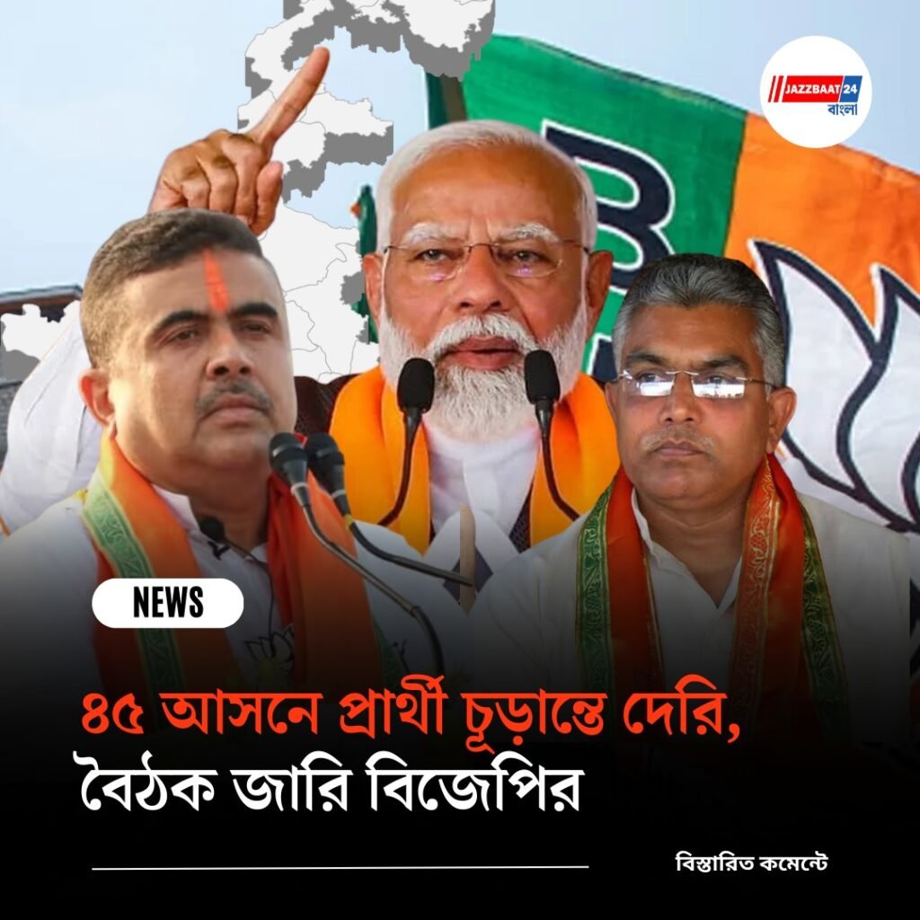 পশ্চিমবঙ্গ বিধানসভা নির্বাচনের আগে প্রার্থী বাছাই নিয়ে এখনও ধোঁয়াশা কাটেনি Bharatiya Janata Party-র অন্দরে। প্রথম দফায় ১৪৪ জন প্রার্থীর নাম ঘোষণা হলেও এখনও প্রায় ৪৫টি আসনে প্রার্থী ঠিক করতে পারেনি দল। ফলে টানা বৈঠকের মাধ্যমে দ্রুত সিদ্ধান্তে পৌঁছনোর চেষ্টা চালাচ্ছে শীর্ষ নেতৃত্ব।সূত্রের খবর, গত কয়েকদিন ধরেই দ্বিতীয় পর্যায়ের বাকি আসনগুলিকে কেন্দ্র করে আলোচনা চলছে। সম্প্রতি Narendra Modi-র নেতৃত্বে সেন্ট্রাল ইলেকশন কমিটির গুরুত্বপূর্ণ বৈঠকও হয়েছে। সেই বৈঠকে প্রায় ১০৫টি আসনে প্রার্থীদের নাম চূড়ান্ত করা হয়েছে বলে জানা গিয়েছে। তবে বাকি আসনগুলিতে প্রার্থী নির্বাচন এখনও চূড়ান্ত হয়নি।
