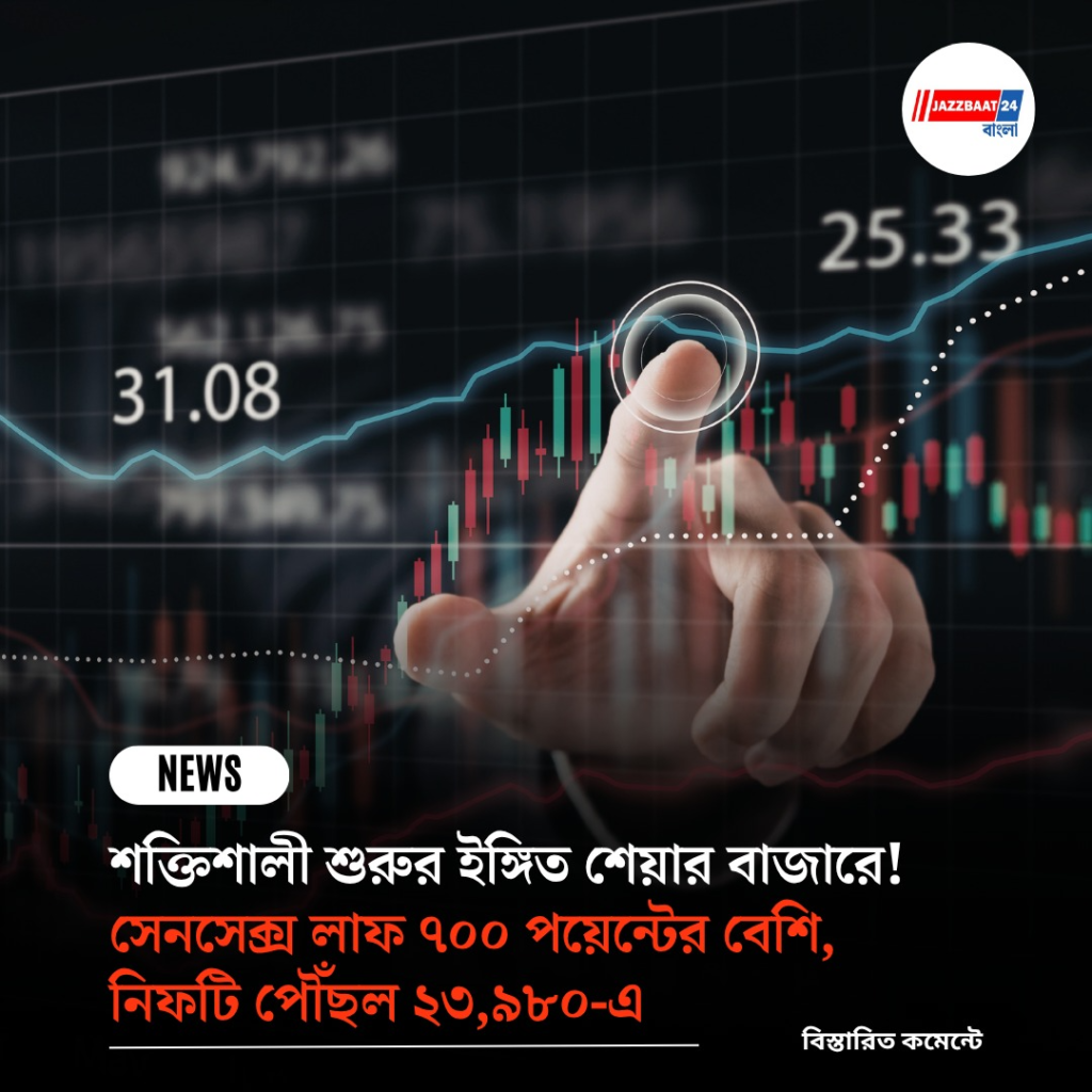 Jazzbaat 24 Bangla > অর্থনীতি > শক্তিশালী শুরুর ইঙ্গিত শেয়ার বাজারে! সেনসেক্স লাফ ৭০০ পয়েন্টের বেশি, নিফটি পৌঁছল ২৩,৯৮০-এ