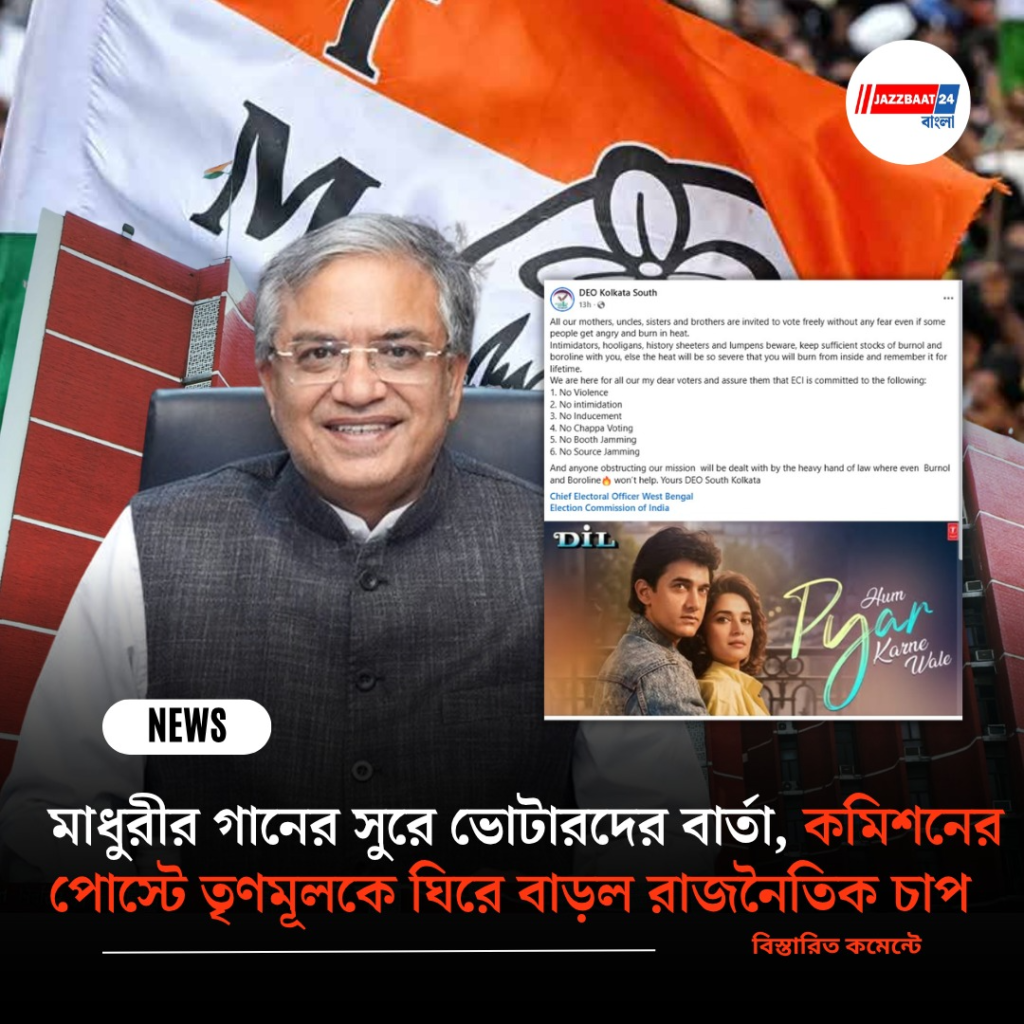 কলকাতা: বিধানসভা নির্বাচন ঘিরে উত্তপ্ত রাজনৈতিক পরিবেশের মধ্যেই এবার অভিনব পথে ভোটারদের উদ্দেশে বার্তা দিল নির্বাচন কমিশন। দক্ষিণ কলকাতার জেলা নির্বাচন আধিকারিকের (ডিইও) সোশ্যাল মিডিয়া পেজে একটি পোস্ট ঘিরে শুরু হয়েছে নতুন বিতর্ক। সেখানে বলিউড অভিনেত্রী Madhuri Dixit ও অভিনেতা Aamir Khan অভিনীত একটি ছবির জনপ্রিয় গানের লিঙ্ক শেয়ার করা হয়েছে। গানটির লাইন— “হাম প্যায়ার করনে ওয়ালে, দুনিয়া সে না ডরনে ওয়ালে…” ব্যবহার করে ভোটারদের উদ্দেশে নির্ভয়ে ভোট দেওয়ার আহ্বান জানানো হয়েছে।